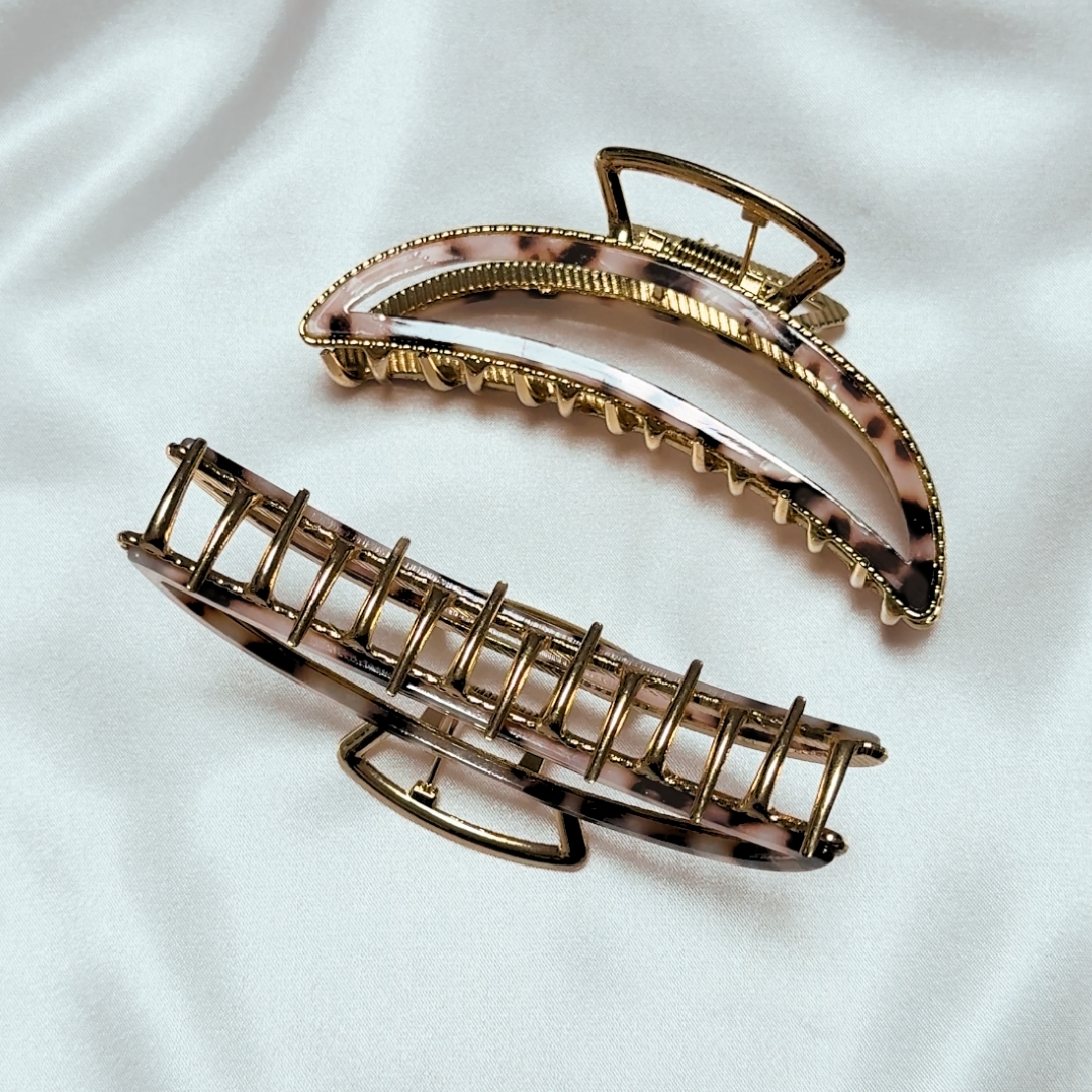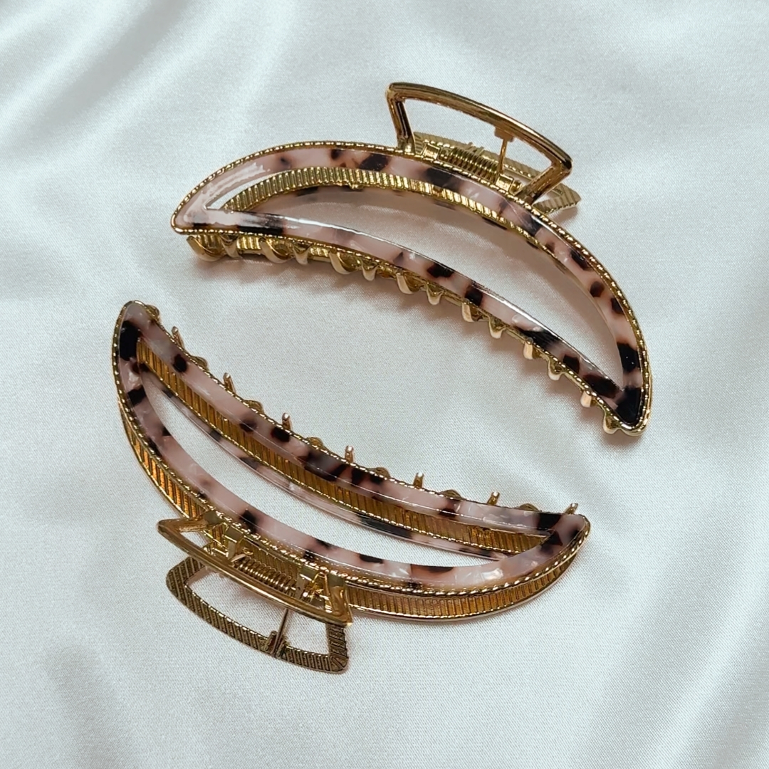 Metalowa klamra Aurora w kształcie półksiężyca ze złotą ramą o delikatnym żłobieniu.