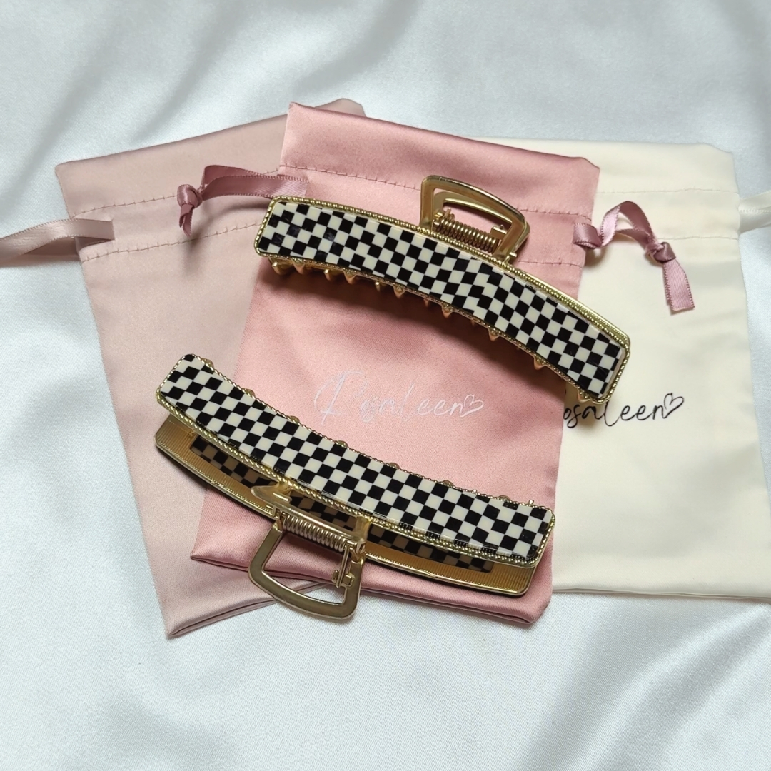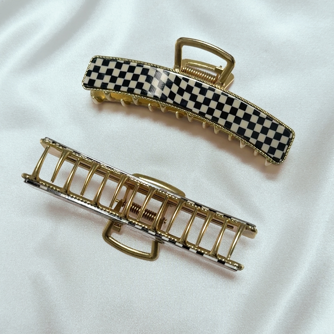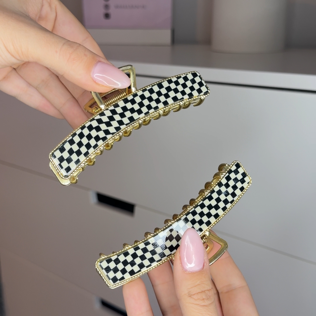 Stylowa i elegancka klamra Black Cube z unikalnym wzorem w czarno-białą kratkę, wykończona złotymi akcentami.