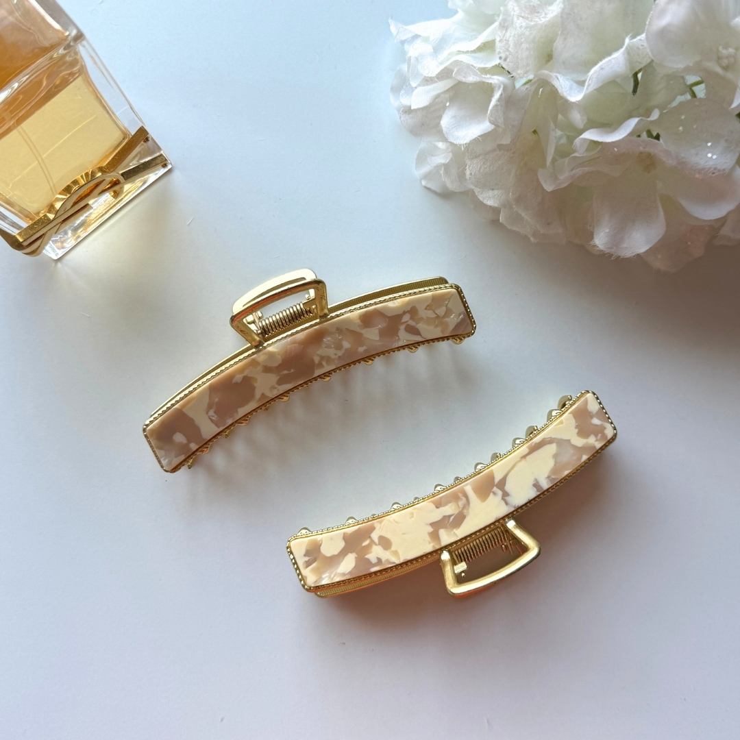 Stylowa i elegancka klamra w kolorze karmelowym, wykończona złotymi akcentami.