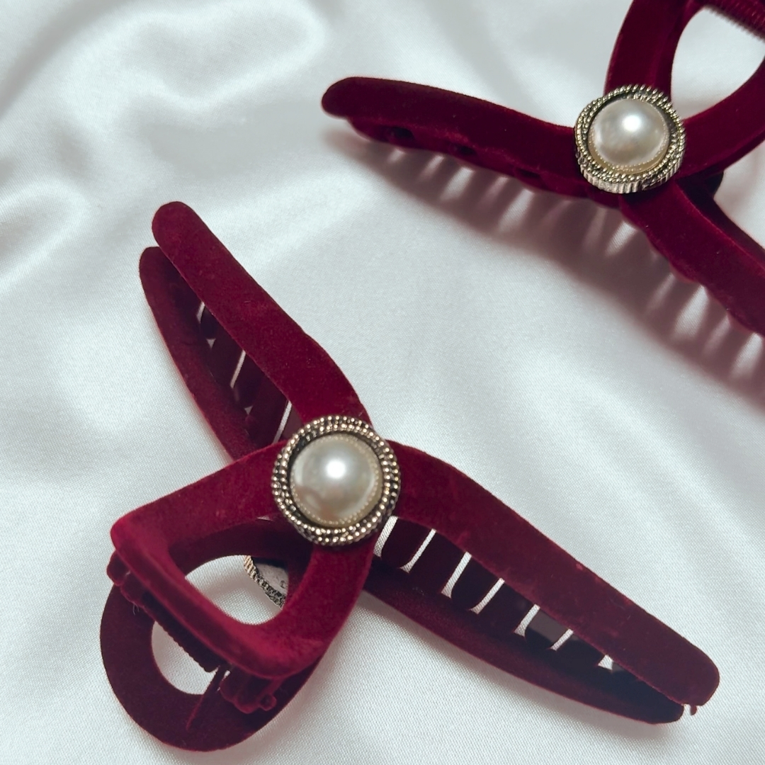 Głęboki bordowy odcień, miękki welur i klasyczna perła sprawiają, że przyciąga wzrok i dodaje szyku każdej fryzurze. ✨🦋