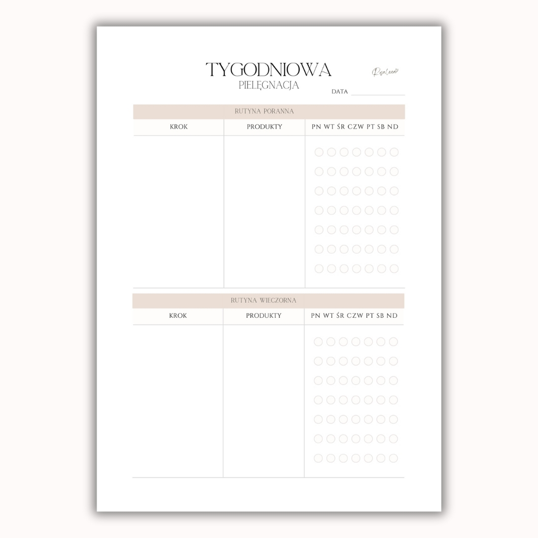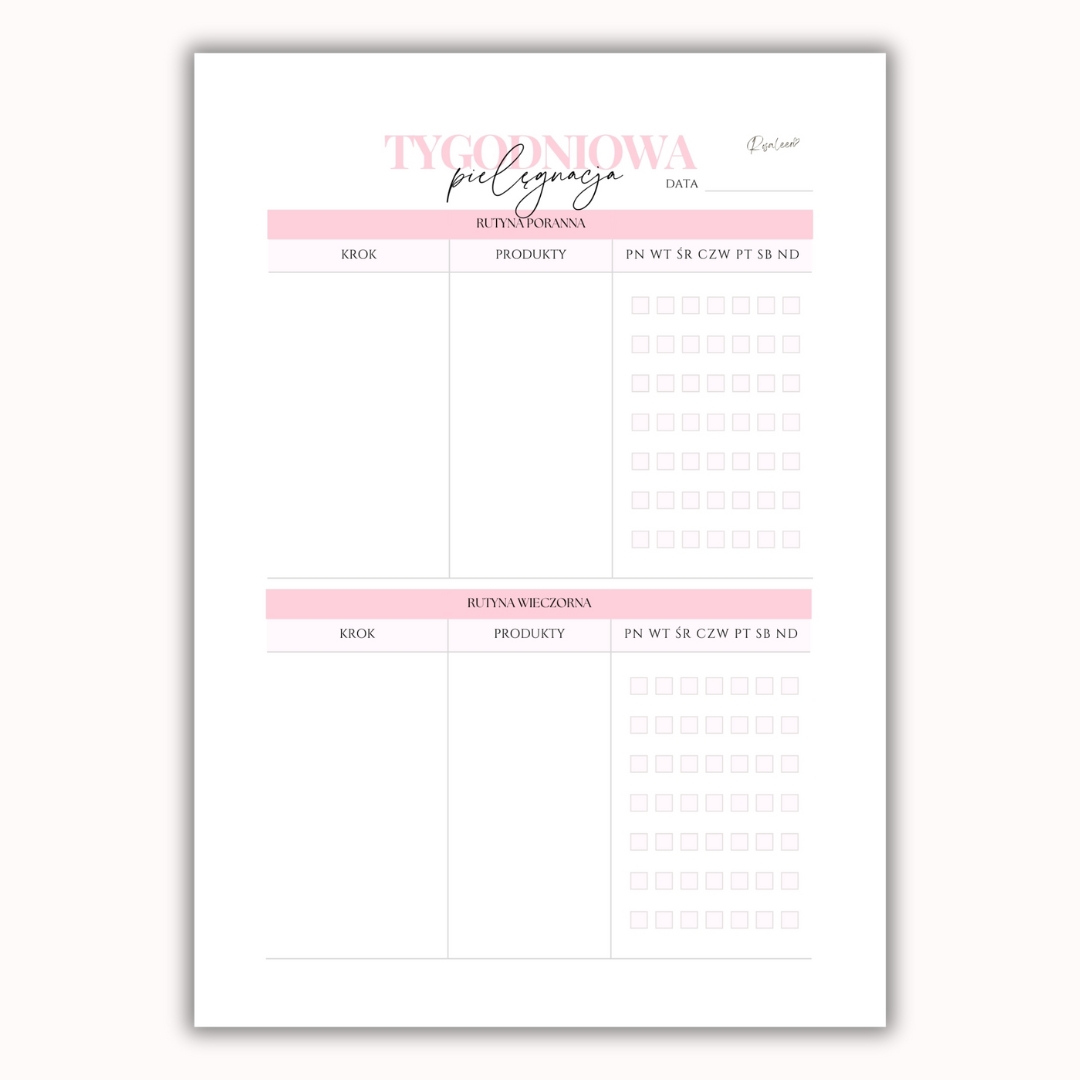 Tygodniowa Pielęgnacja Self-care to idealne narzędzie, które pomoże Ci stworzyć spójną, świadomą rutynę dostosowaną do Twoich potrzeb.