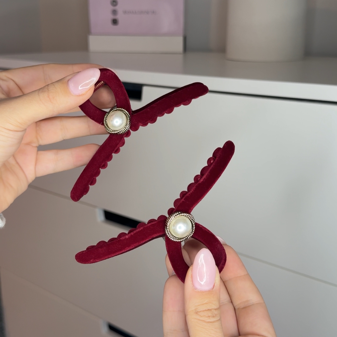 Głęboki bordowy odcień, miękki welur i klasyczna perła sprawiają, że przyciąga wzrok i dodaje szyku każdej fryzurze. ✨🦋