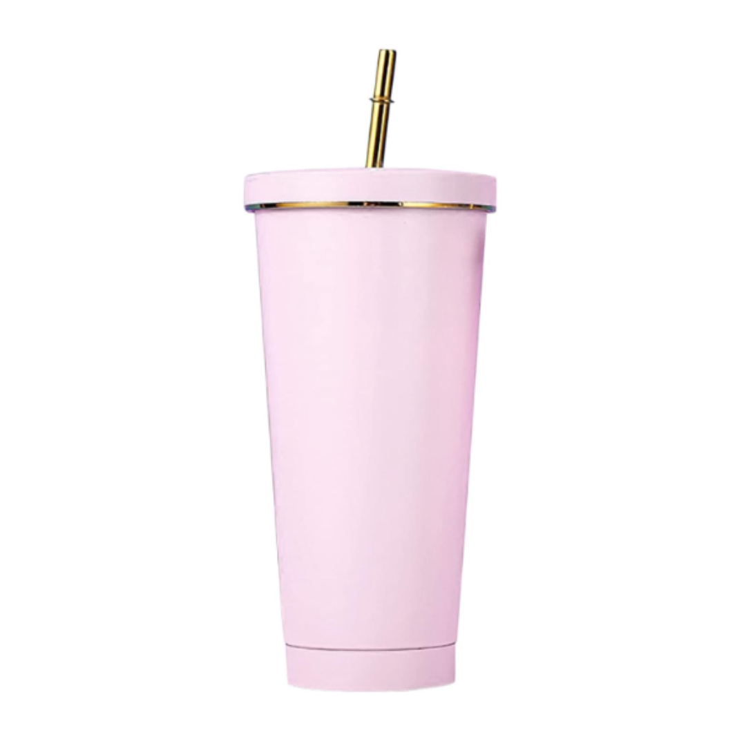 Miami to kubek w kolorze pudrowego różu, wykonany ze stali nierdzewnej, ozdobiony w minimalistyczne, złote elementy oraz złotą słomkę.