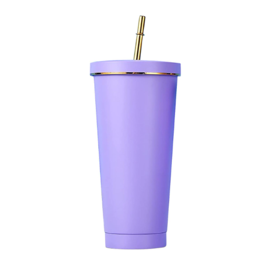 Buenos Aires to fioletowy kubek ze stali nierdzewnej ze złotymi elementami oraz złotą słomką.