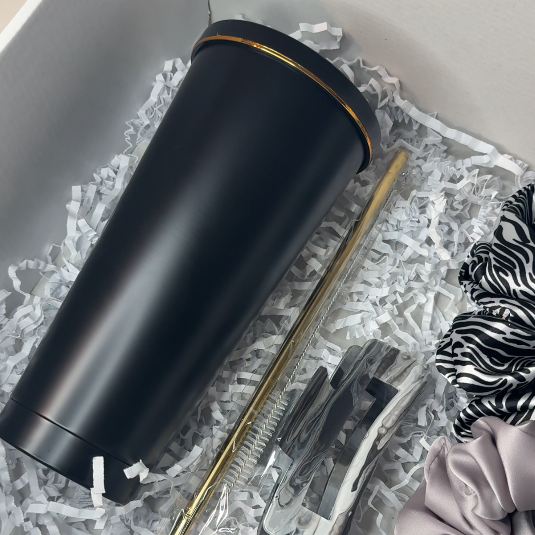 • Kubek ze stali nierdzewnej ze złotymi elementami oraz czyścikiem