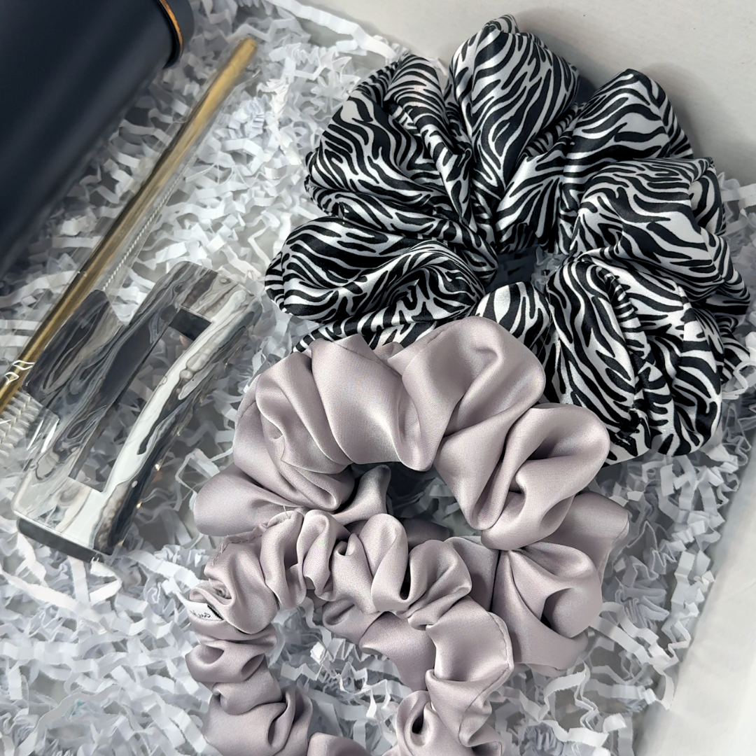 • Szara gumka scrunchie w rozmiarze S i M, wykonane z miękkiej tkaniny z dodatkiem jedwabiu