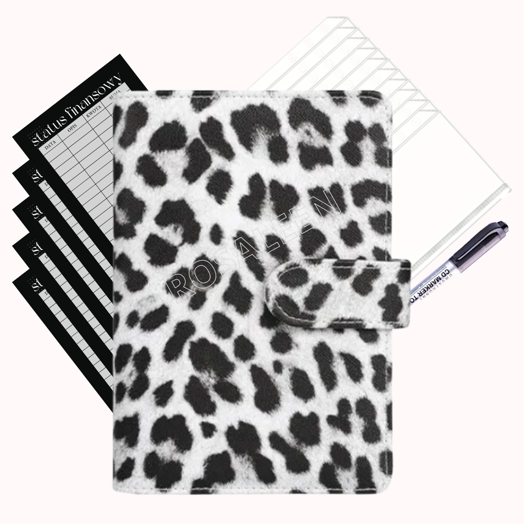 Zestaw White Leopard do oszczędzania metodą kopertową. Przeznaczony dla osób pragnących zapanować nad wydatkami i oszczędnościami oraz dla tych, którzy chcą w pełni kontrolować swoje finanse.