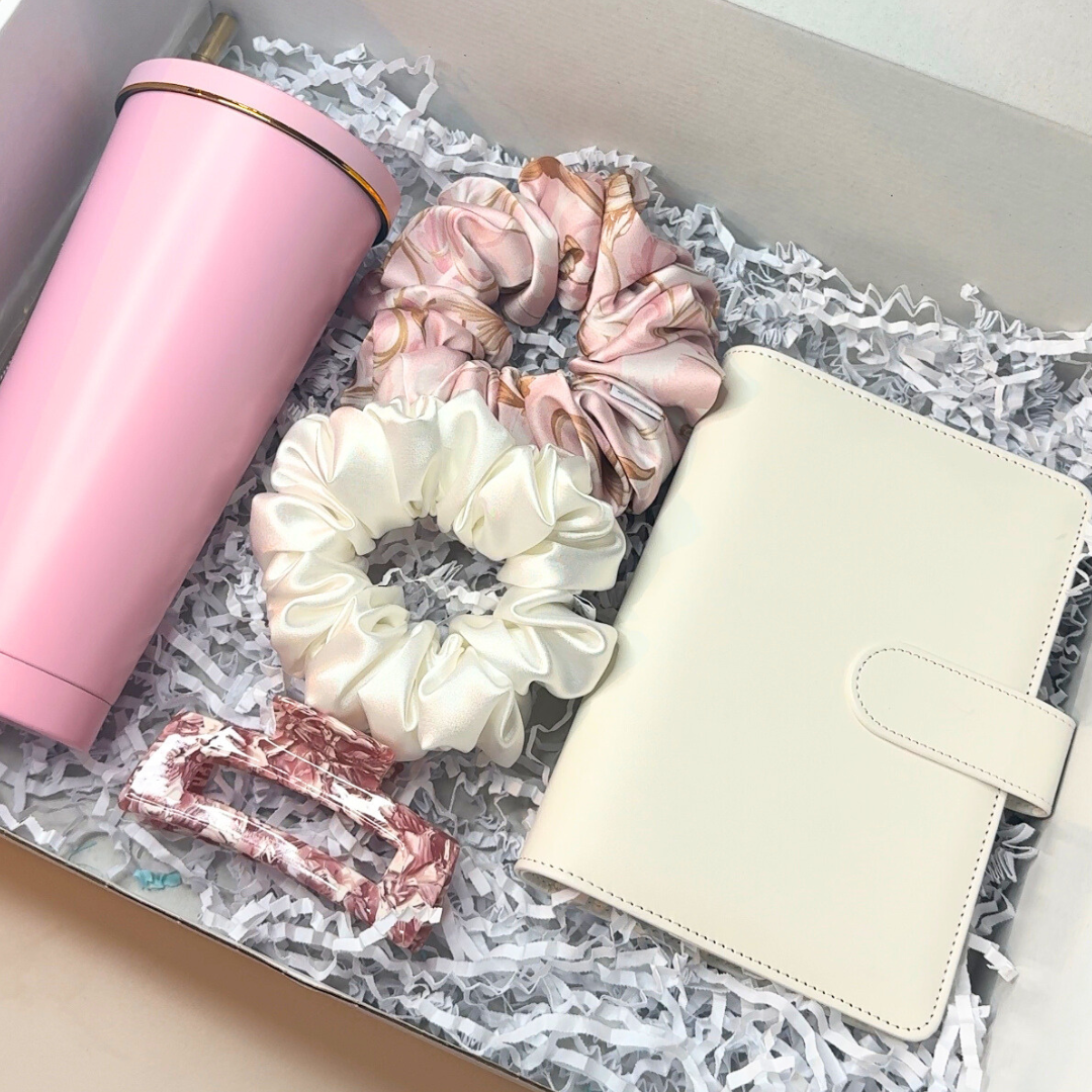 Kubek ze stali nierdzewnej, organizer z wyposażeniem, ręcznie szyte scrunchies w rozmiarze M oraz klamra